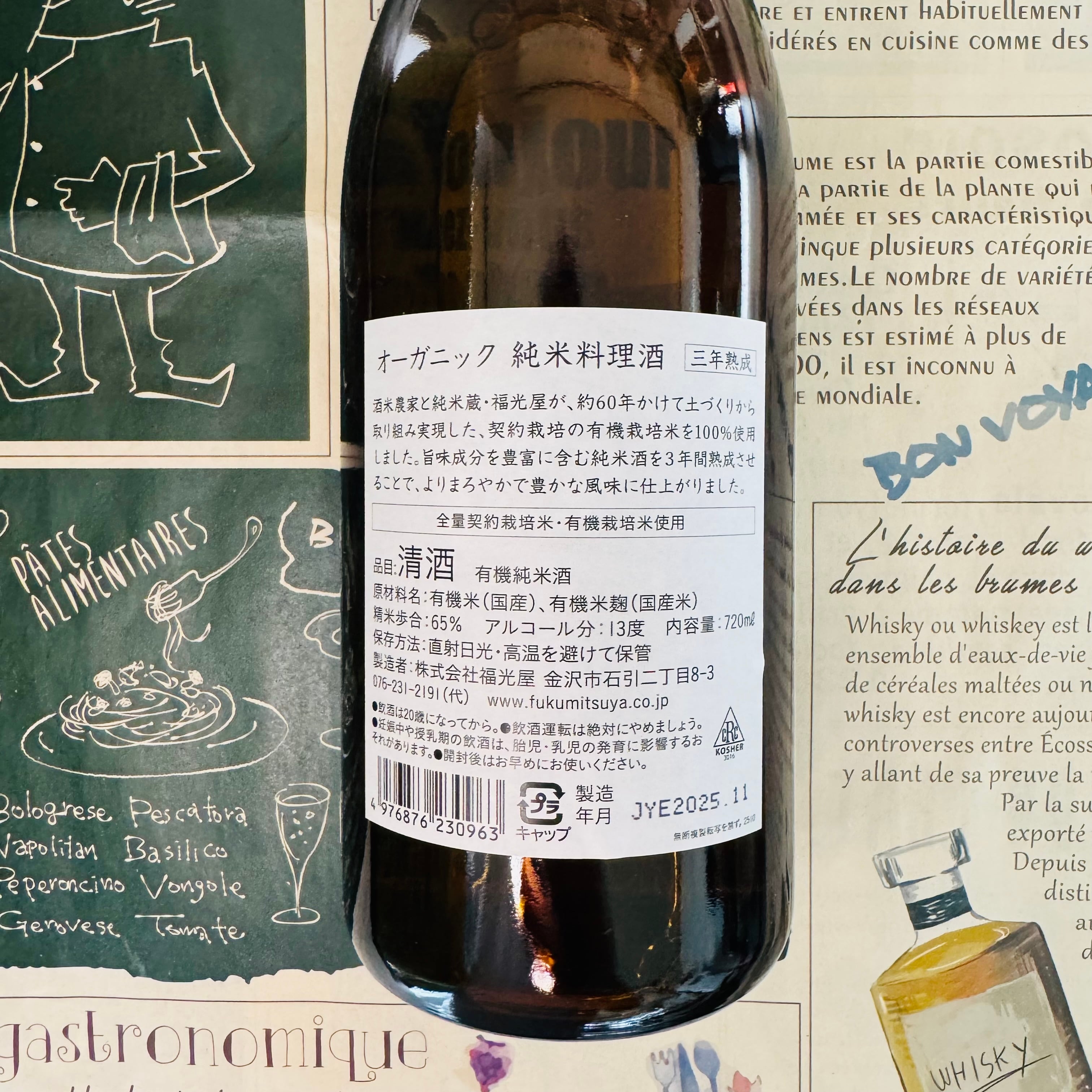酒米農家と福光屋が約60年の歳月をかけて土づくりから取り組み実現した、契約栽培の有機栽培米を100%使用し、有機認証を取得した「壽蔵(ことぶきぐら)」で醸造した純米料理酒です。丹精こめて栽培された有機米と霊峰白山を源流とする百年水、金沢特有の気候で伸び伸びと育つ麹や酵母を用い、原材料にこだわりました。アミノ酸や有機酸などの旨味成分を豊富に含む純米酒をさらに3年間熟成させることで、よりまろやかで豊かな風味に仕上がっています。食材本来の美味しさを引き出し、和食はもちろん、洋食、中国料理など、あらゆる料理を味わい深く仕上げます。厳しい日本酒の有機認証を取得しています。
