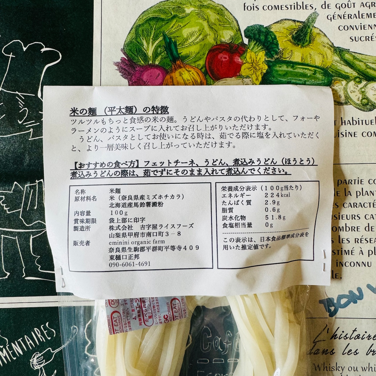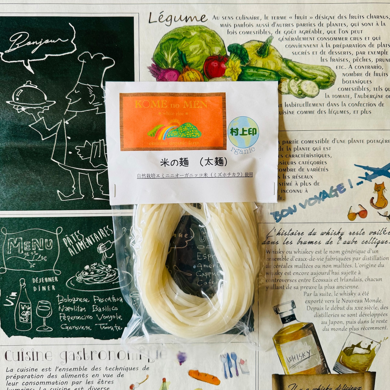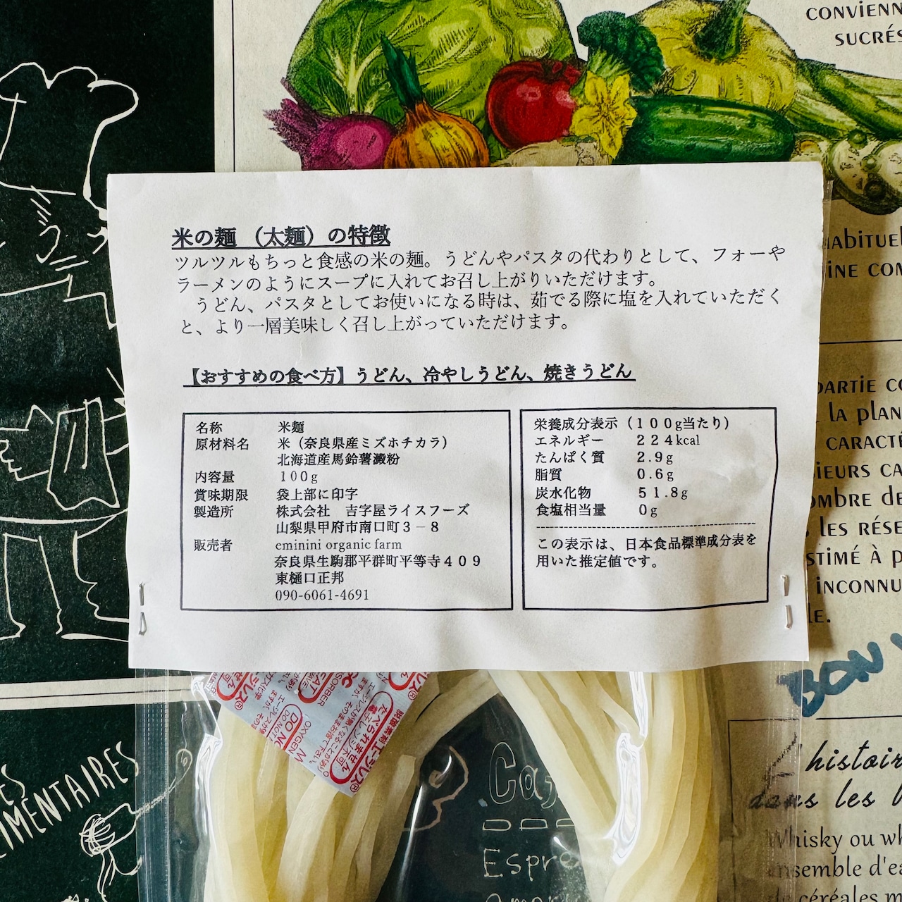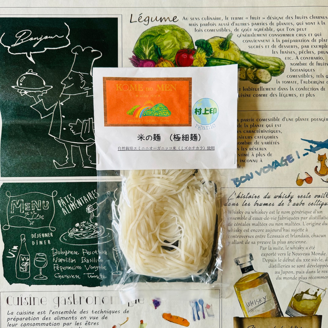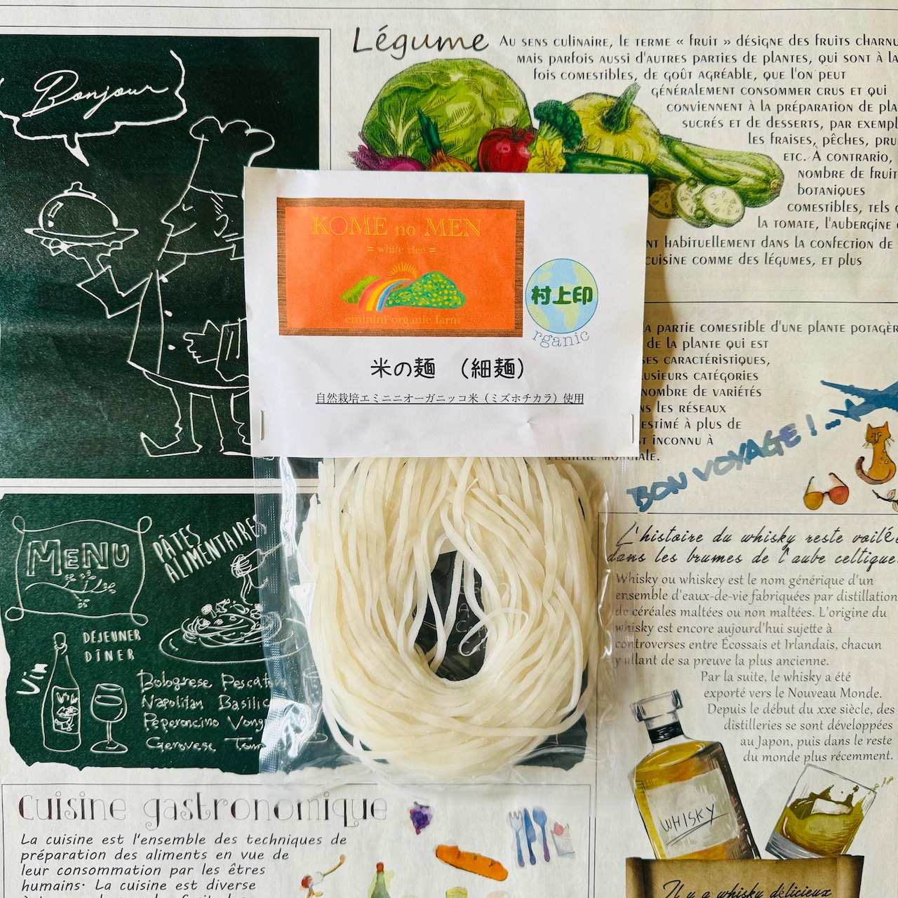 自然栽培で育てたエミニニオーガニッコ米(白米)と、馬鈴薯澱粉のみで作ったお米の麺。お米の品種や製麺方法をリニューアルし、さらにつるつる美味しくなりました